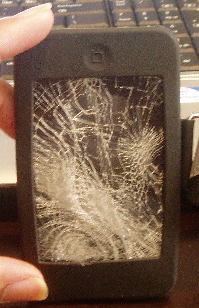 speeds through as if he were at the Indy raceway instead of a pedestrian crossing. Imagine people scrambling to get out of his way. In the chaos, suppose you dropped your jacket in the road just as he zoomed through. Drats!! Tire marks on your jacket, but it can be washed. Imagine retrieving your jacket and realizing that you had your iPod touch in your pocket. How bad could it be? Perhaps it was cushioned enough to not have been damaged.